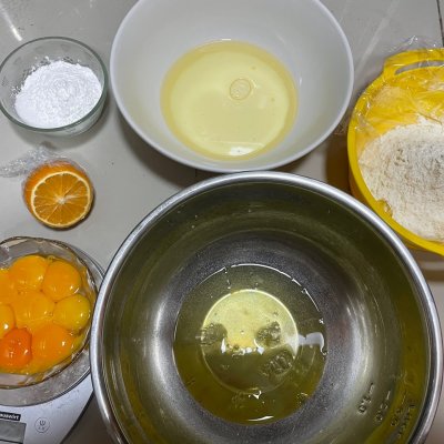 1準備好所有食材,蛋白蛋黃分離好,蛋白放入無油無水的乾淨盆裡。