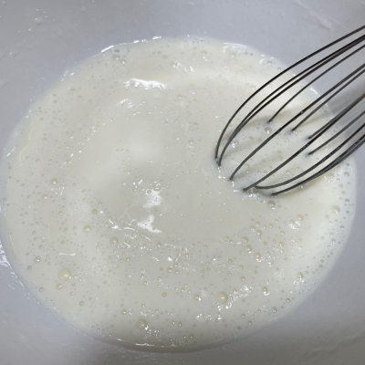 2先將牛奶和玉米油混合快速攪打,使其完全乳化(其實就是讓兩者儘量融合)