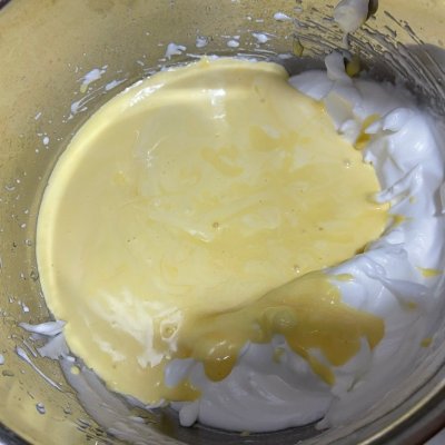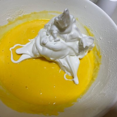 8將打好的蛋白糊取三分之一倒入蛋黃糊