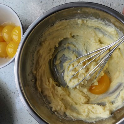 2、乳酪隔水融化,加入牛奶和黃油,分次加入蛋黃,最後加入低筋麵粉。